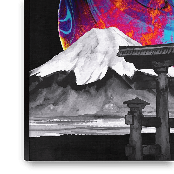 A surreal cosmic landscape where tradition meets the stars. White cranes fly past a marble-textured planet rising over a snowy Mount Fuji. Framed by a torii gate, it creates a dreamlike, spiritual atmosphere in deep monochrome and teal.