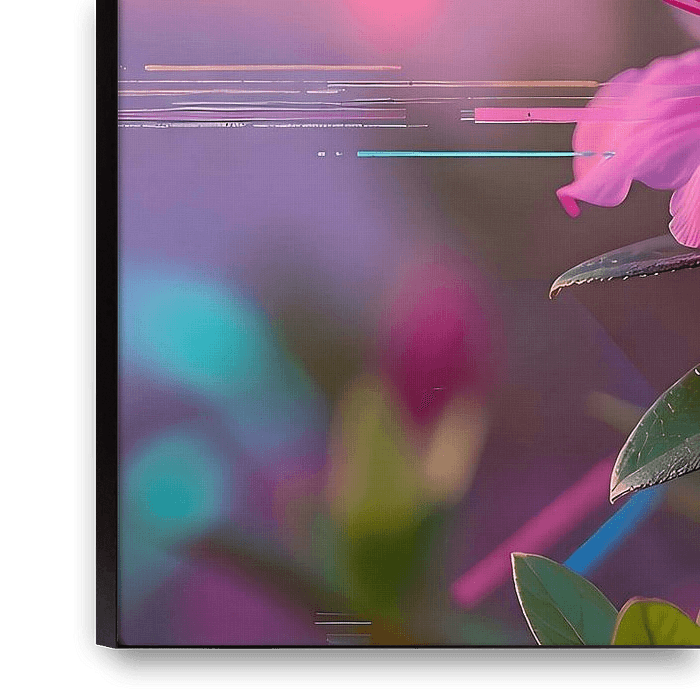 A stunning digital fusion of nature and abstract art. This piece captures the delicate beauty of a blooming pink flower, contrasted against a vibrant, glitch-inspired background with streaks of neon light. The interplay between the organic floral details and the modern digital aesthetic creates a unique, contemporary atmosphere perfect…