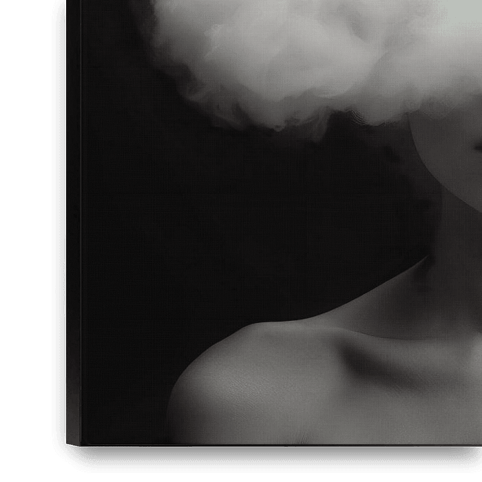 The image shows a woman whose head is partially obscured by a white cloud. The contrast between the vaporous cloud and the black background accentuates the surreal effect of the scene.