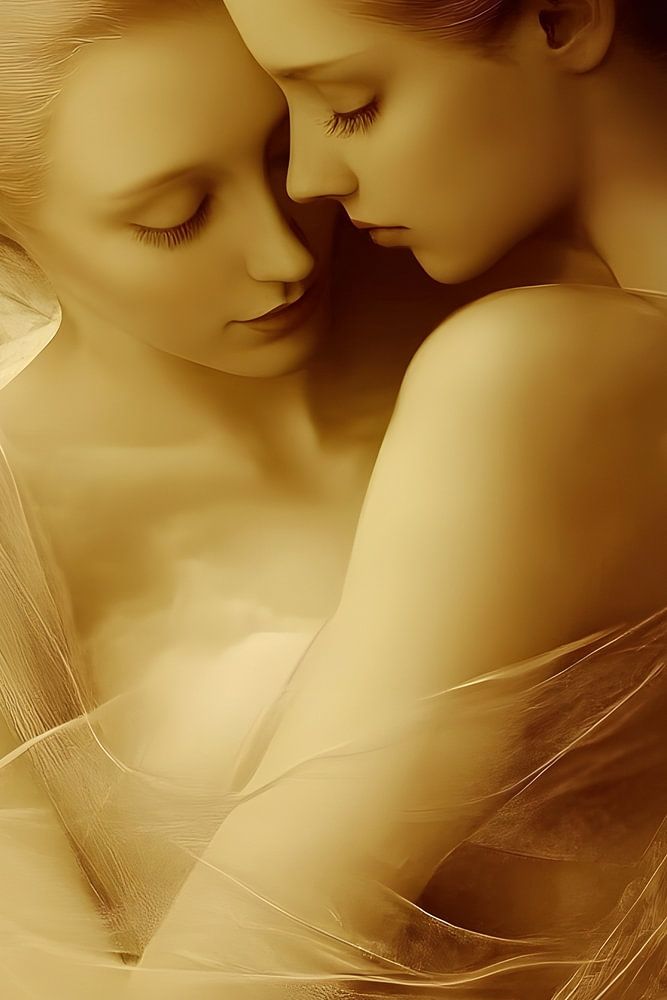 The picture shows two women in an intimate embrace, surrounded by a dreamlike and fantastic backdrop. Their bodies seem almost weightless, as if they are floating in an ethereal space between dream and reality. The soft lines of their silhouettes are surrounded by delicate, shimmering colours reminiscent of the light of a sunset or the glow of the moon.