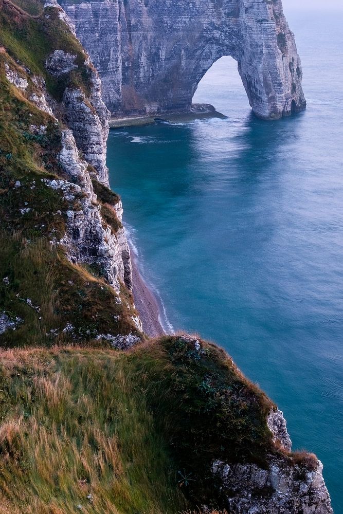 Beautiful imposing rocks at Etretat. Here in image La Manneporte.