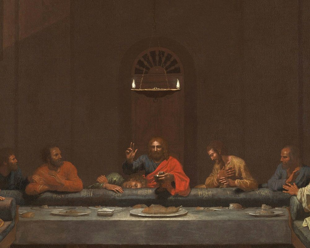 In his representation of the Eucharist, Poussin captures the solemnity of the Last Supper, illuminated by candlelight. Christ is central in the scene, simultaneously holding the bread and cup of wine and bestowing a blessing with his other hand. He reclines at a Roman triclinium, flanked by six disciples on each side, with Judas likely being the second from the left, distinguishable as he is the only one not turned towards Christ. Adding a dynamic element to the otherwise tranquil composition, a shadowy figure is seen withdrawing through an open doorway in the background.