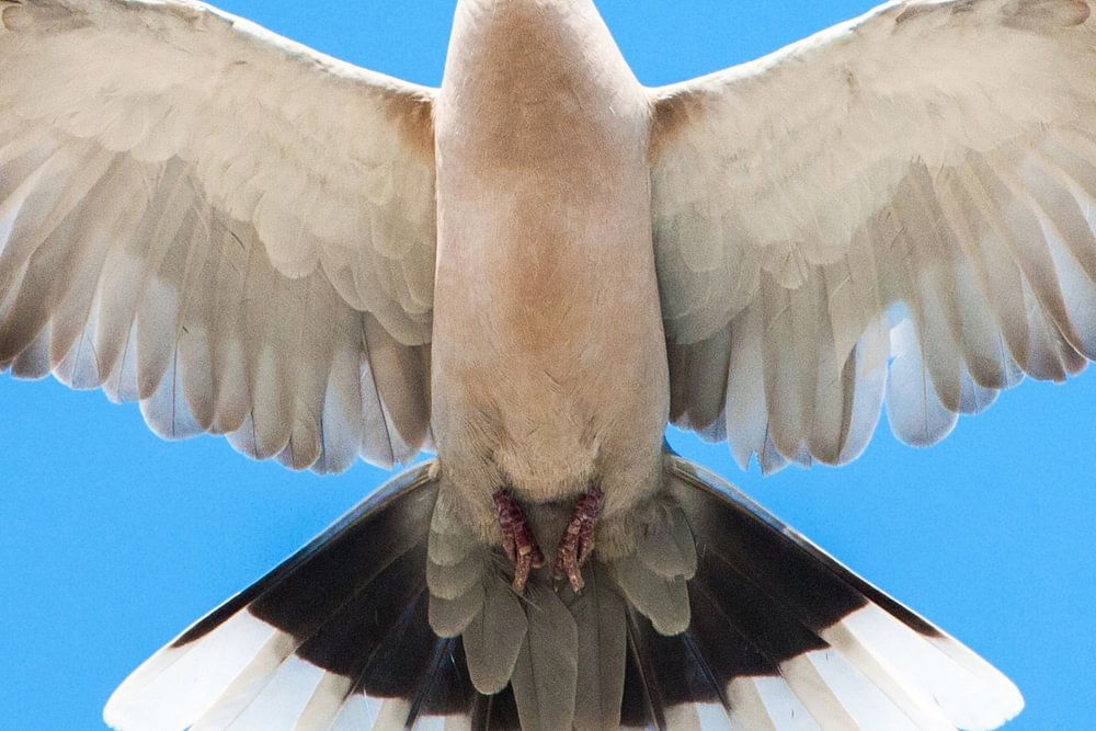 Eurasian Collared Dove (Streptopelia decaocto) on the Greek island of Lesvos. Flying overhead.