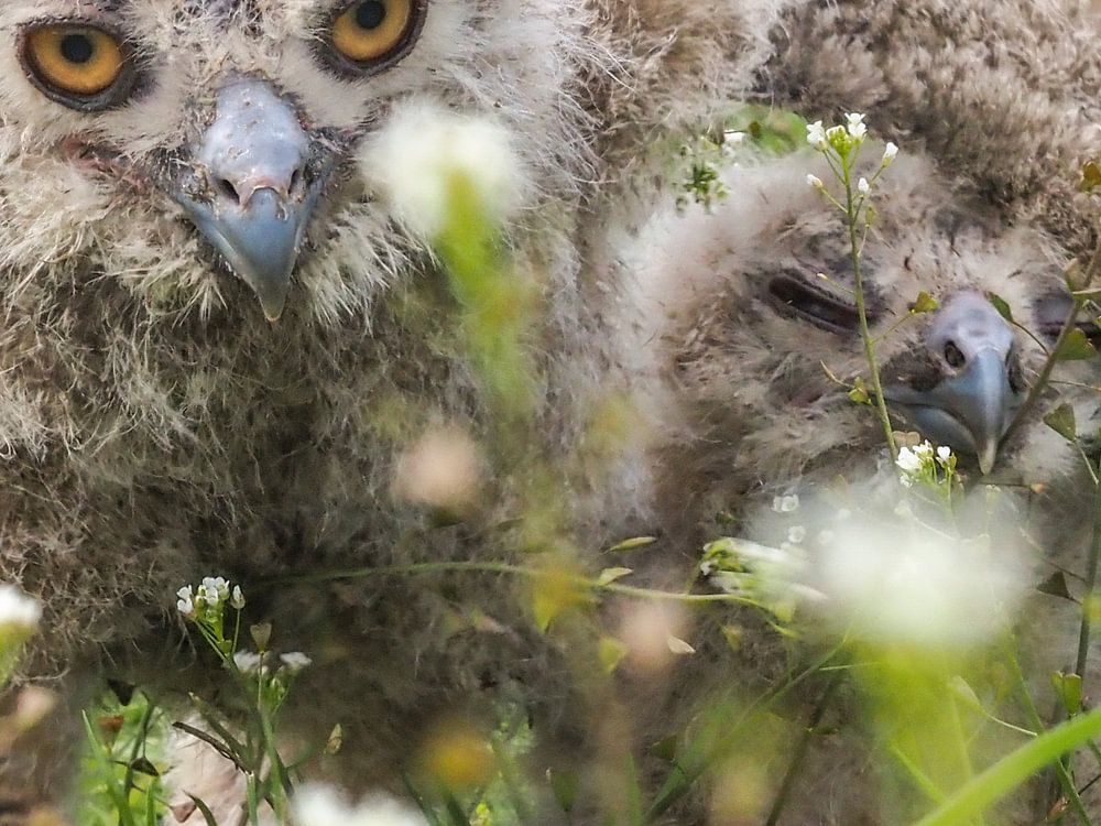 Young European eagle owl, about 4 to 6 weeks old. The eagle owl (Bubo bubo) is one of the largest owls in the world, and probably the second largest species of owl after the Blakistons fish owl.