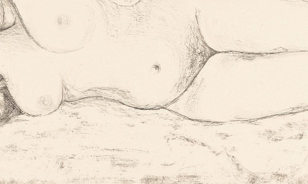 Ici, la femme est allongée nue sur le sol, la pomme à la main, le corps nu. De ce fait, les jambes, le ventre, les hanches, le torse et les seins de la jeune fille sont exposés dans le portrait, un portrait nu.