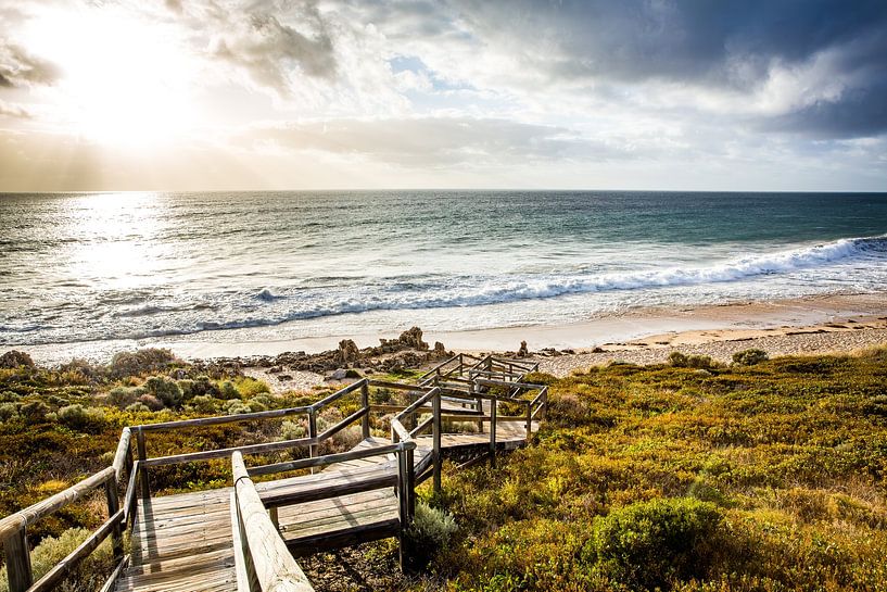 From an elevated viewpoint, a calm view of the Australian coastline unfolds in the late evening. In the foreground, a wooden staircase with a railing gently leads down toward the beach, creating a strong leading line that draws the viewer into the scene. In the midground, the sandy beach stretches out, framed by dunes with typical…