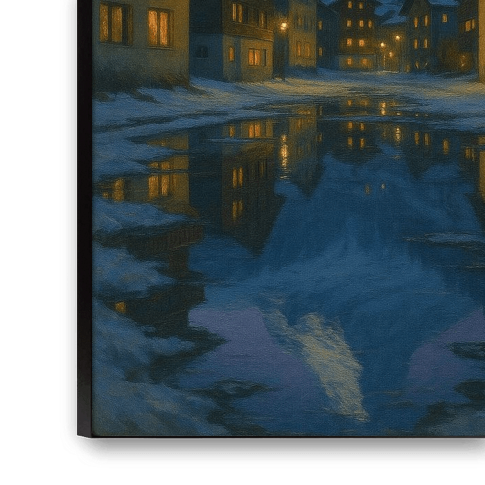 The smooth, icy water becomes both mirror and memory, capturing the fragile beauty of winter evenings when time slows to a near standstill. The palette — a harmony of indigo, gold, and soft white — evokes serenity, nostalgia, and peace.