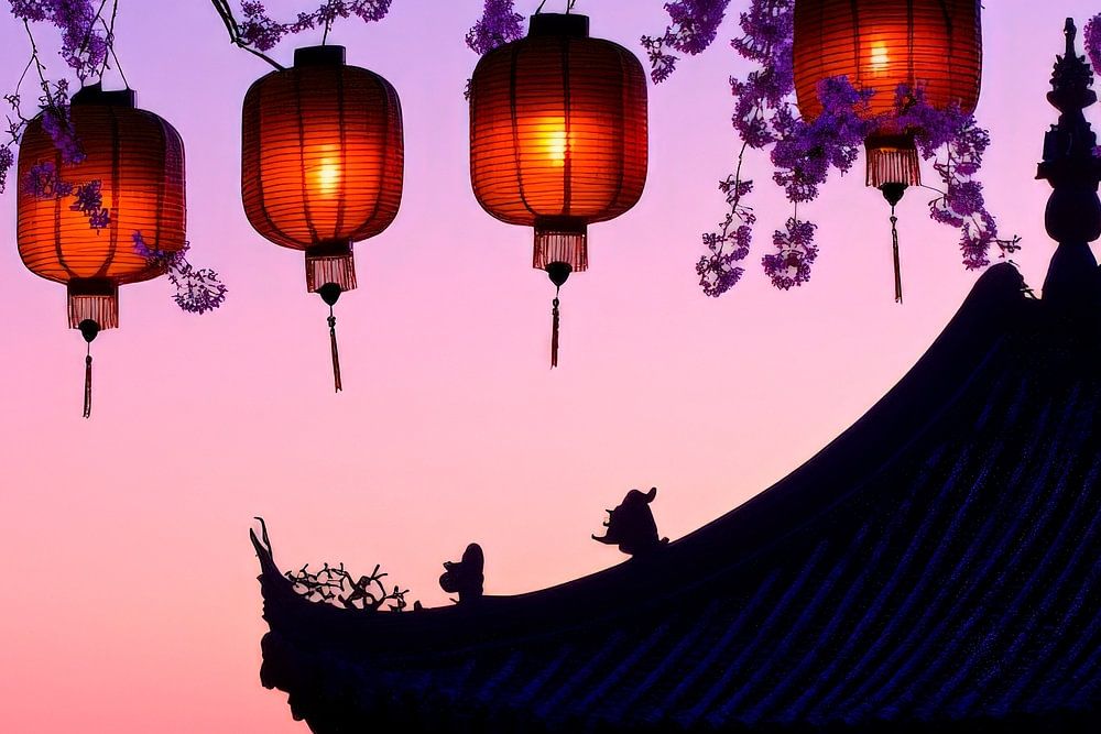Soft purple clouds envelop a picturesque pavilion, while lantern-shaped lights radiate mysterious light. Enchanted by this harmonious scene, delicate flowers bloom in the background. This artwork blends perfectly into a living room to create a calming, relaxing atmosphere - ideal for moments of reflection and communion.
