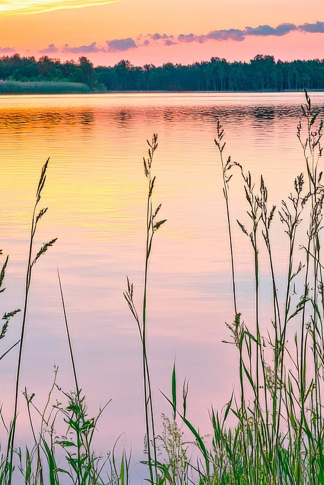 A gentle colour gradient in the sky heralds the end of the day, while the calm water reflects in harmonious tones. Delicate grasses and blooming flowers frame the shoreline, a picture of calm and balance. Nature exhales peace and invites you to savour the moment.