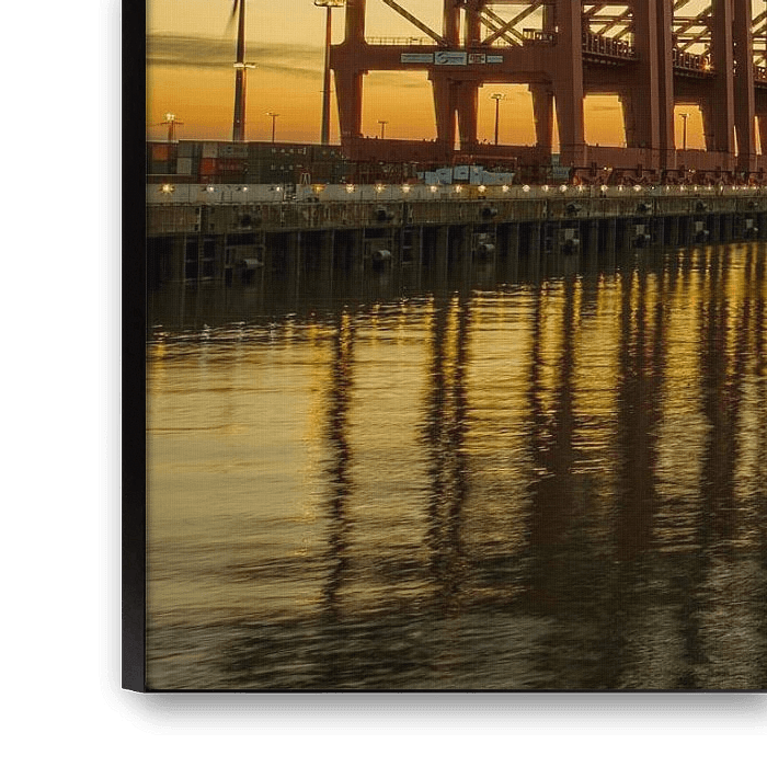 Hamburg's Burchardkai in the golden light of sunset: majestic container cranes line the calm water, while the sky glows in warm colours. Without ships, the terminal unfolds its quiet, graphic beauty - a symbol of movement and pause at the same time. Industry meets nature, structure meets light. A picture for lovers of urban expanse and Hanseatic serenity.