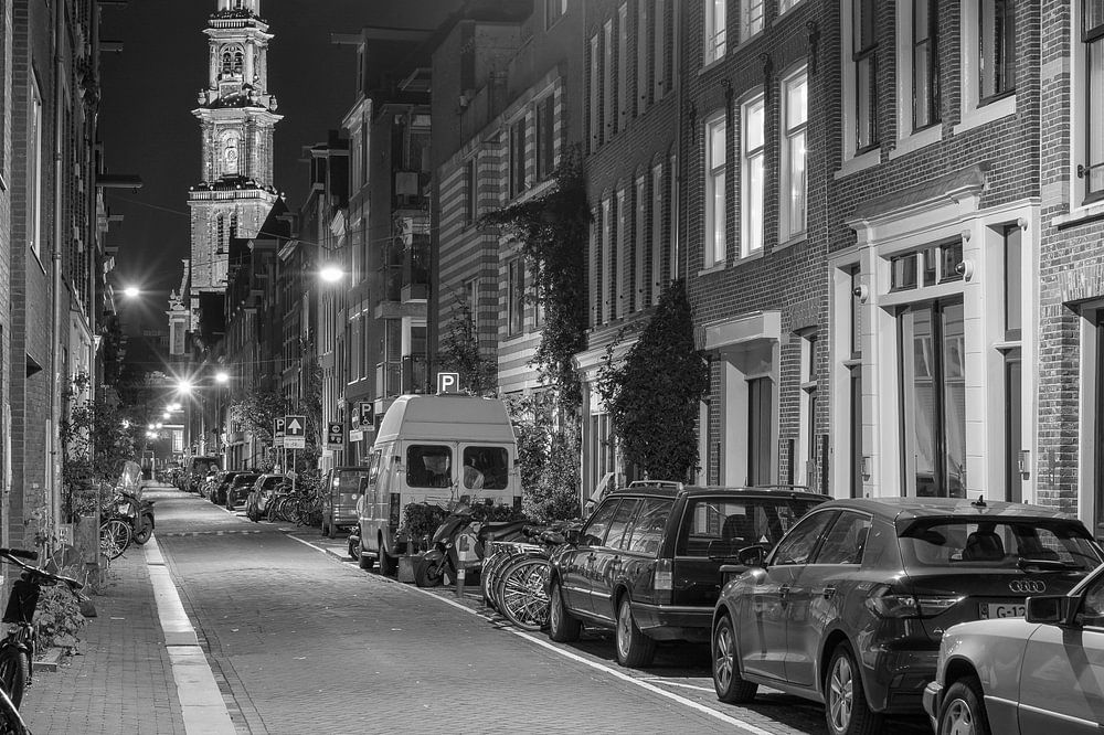 This work shows an evening photograph of the Westerkerktoren, seen from the Bloemstraat in the heart of the Jordaan district of Amsterdam.