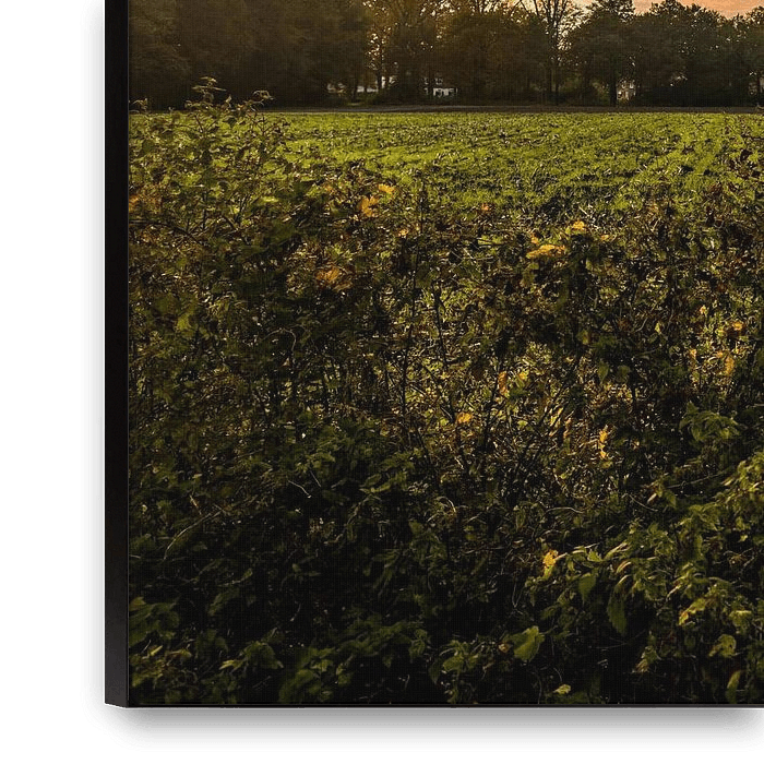 In this photograph, the warm evening light falls across a tranquil landscape in the Achterhoek region. The setting sun colours the sky in soft shades of gold, orange and blue, while the light slowly moves across the fields and meadows. On the right-hand side of the image is a field of tall corn plants illuminated by the last rays of…
