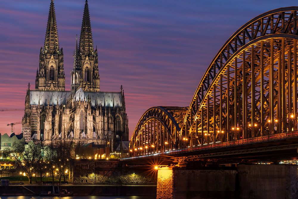The sky shines in vibrant colours - from soft pinks and purples to deep blues - and is reflected in the calm waters of the Rhine. The twinkling lights of the city and the bridge lend the scene a romantic atmosphere and invite you to enjoy a view of Cologne that is both vibrant and calming.