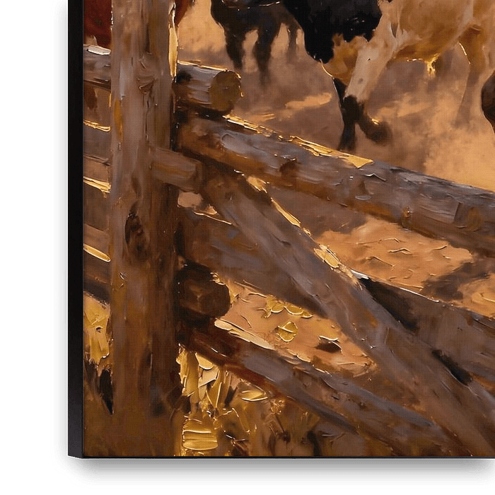 A cowboy rides confidently alongside a moving herd of cattle, his silhouette framed by a radiant golden sunset stretching across the horizon. As hooves meet the dry earth, dust rises in soft, billowing clouds, catching the warm light and transforming motion into atmosphere. The fading sun casts gentle highlights and elongated shadows,…