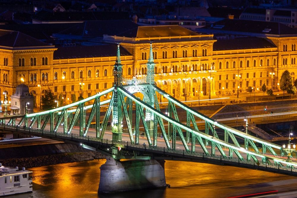Evening panorama of Budapest with the Danube and the Liberty Bridge in the foreground