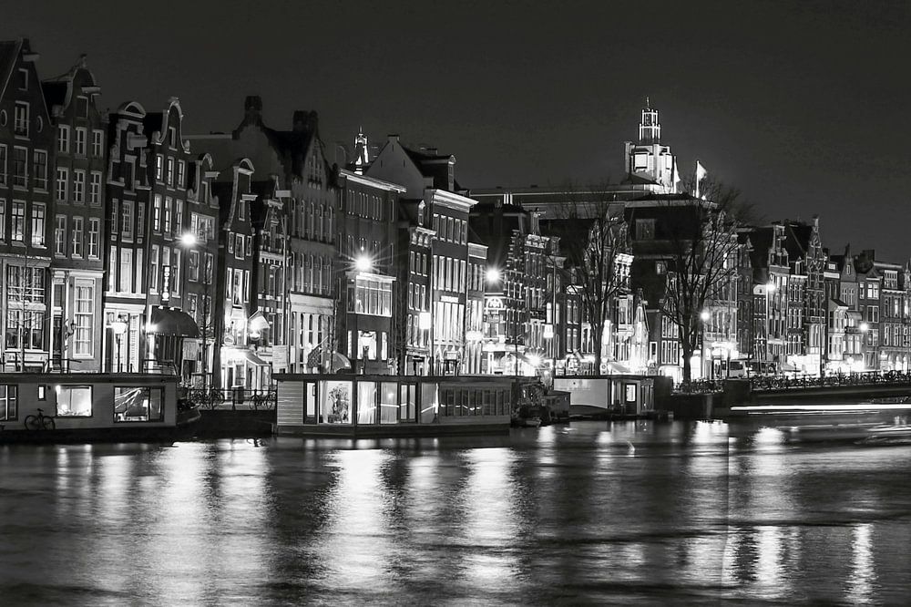 Buy the photo Evening photo of Amsterdan in black and white by W J Kok on canvas, ArtFrame, poster and wallpaper, printed on demand in high quality.