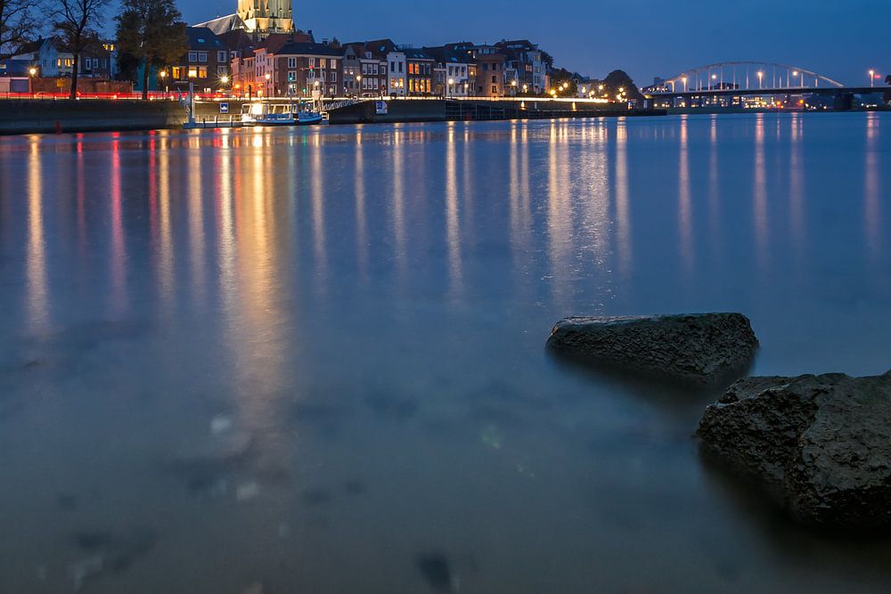 Deventer at night with view over the river Ijssel from a beach. The tower church is towered above the beautifully-featured cityscape.