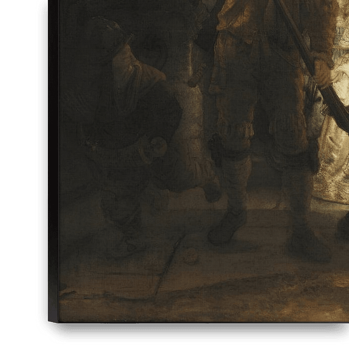 Excerpt from the Night Watch. The company of Captain Frans Banninck Cocq and Lieutenant Willem van Ruytenburgh prepares to march out, better known as the Night Watch, is a militia painting by Dutch painter Rembrandt van Rijn (1606-1669) and was completed in 1642. The painting is owned by the municipality of Amsterdam and has been part of the Rijksmuseum Amsterdam collection since 1808. The canvas shows the two archers from the title, accompanied by other militiamen, as well as a few extras, as they line up. The Night Watch is one of the most famous paintings in the world, and the painting was Rembrandt's contribution to a project of seven works, six militia pieces and a portrait of the target men of the Kloveniersschutters, commissioned by the Amsterdam militia guild for the Kloveniersdoelen's grand ballroom. It is Rembrandt's first and only militia piece. Compared to other canvases of the genre, Rembrandt's work is a lively and bold composition, in which the militia does not pose in the usual static arrangement, but is depicted while grouping. The canvas is a rich work of baroque complexity, in which realism and symbolism are skillfully combined in a masterful integration of movement, light and colour, brought into harmony by a delicate pattern of chiaroscuro. In these aspects, the Night Watch represents the pinnacle of Rembrandt's painting.