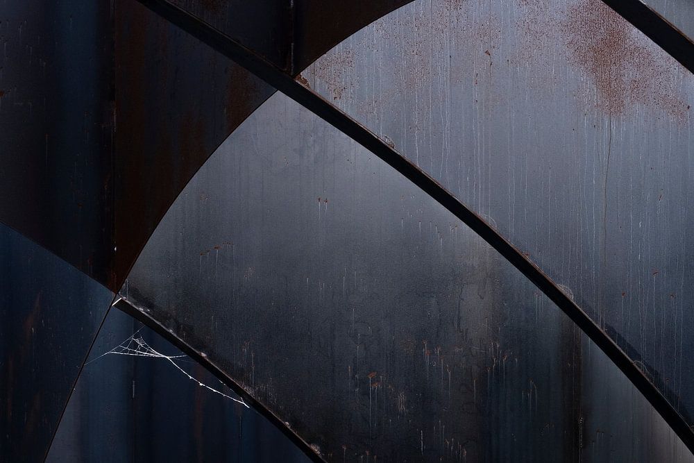 This metal structure has infinite shapes. This is one of many variants. The curved lines offer a nice view through to the area behind and forms a natural backdrop. The incidence of light on the blue metal creates tension in the composition. Photographing only one detail creates a beautiful abstraction in cool shades of blue. The subtle cobweb attracts attention and adds value to the abstract image. The repetitions in the curved lines also make the picture pleasant to look at