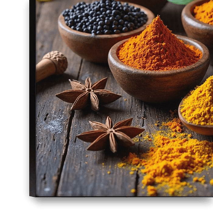 An atmospheric top-down image full of colourful spices, star anise, chillies and handmade earthenware bowls. The smell of distant kitchens and the warmth of craft in your interior.