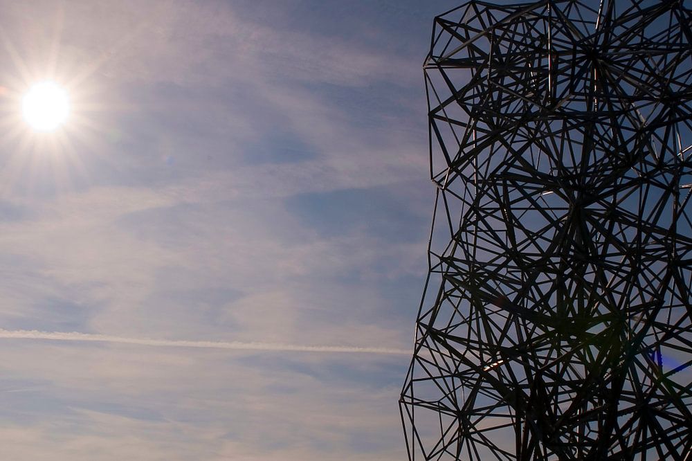 beeld van staal de hurkende man oftewel Exposure genaamd te Lelystad.