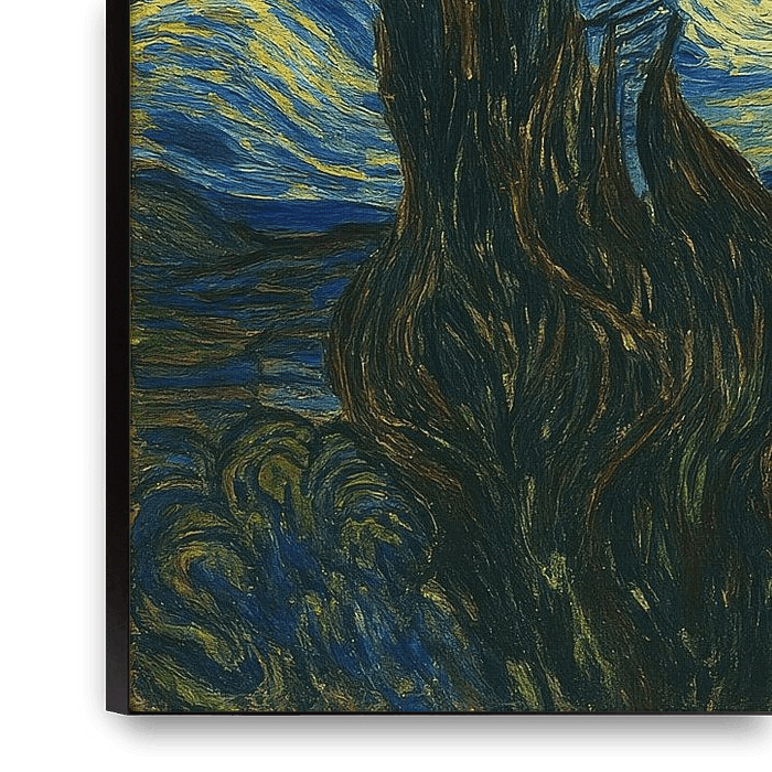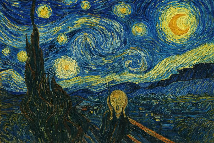 Under a swirling night sky, swirling stars and a bright moon sway over a quiet village. On the left, a dark cypress rises as a contrasting shape, while on the bridge, an expressive figure with an open mouth adds tension. The strong blue-yellow contrast and short, rhythmic touches add dynamism and depth. The composition links calm and…