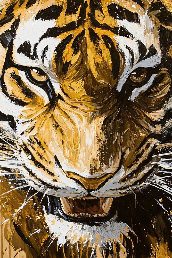 This impressive artwork depicts the powerful head of a tiger, rendered in an expressive style with dynamic brushstrokes. The paint seems to be dripping off the canvas, giving it a unique and energetic look. The gold and black tones accentuate the powerful presence of the animal, while the white details provide a nice contrast. This painting is ideal for animal and art lovers looking for a statement piece for their interiors. With its vibrant look, it fits perfectly in modern spaces such as an office or bedroom and adds a touch of power and dynamism to any room.