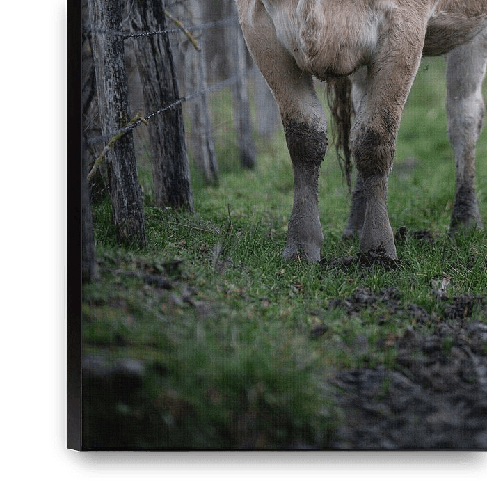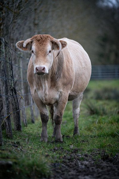 A cow looks directly at the camera, creating an intimate moment of eye contact. Her face is sharply in focus, while the background of grass and open landscape softly fades away. The focus on her eyes creates a sense of closeness and connection with nature, while the landscape in the background emphasises space and tranquillity.