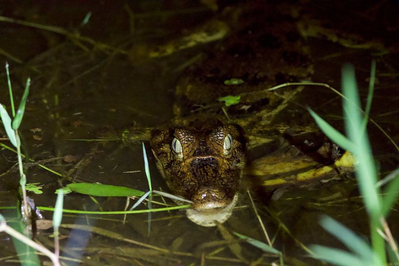 In this picture, a young spectacled caiman stands face to face with the viewer. Its head protrudes just above the water, so all attention goes to its eyes. The gaze is direct and inquisitive, without threat. It is precisely this proximity that makes the picture strong: small in size, but fully present.