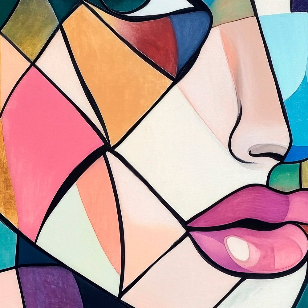 A kaleidoscope of colours and shapes comes to life as a mysterious beauty peers through smooth lines and geometric fragmentations. Her radiant eyes cast a spell over the viewer, while the soft colour tones between pastel and bold accents create a harmonious yet fascinating duality. Words seem superfluous before such vivid expressiveness.