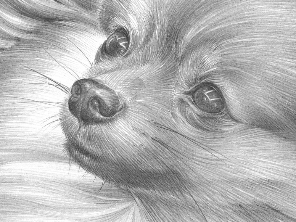 This detailed drawing is dedicated to the face of a small, cute male Pomeranian. It shows the expressive face of a fluffy dog with dark, soulful eyes. The flowing coat is drawn with fine, flowing lines and conveys a lifelike feeling of movement and softness.
