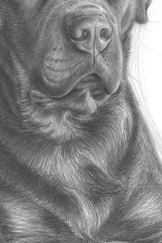 This detailed and realistic pencil drawing is dedicated to the face of the large dog with expressive eyes and shiny fur. Using fine lines and subtle shading, I have captured the textures of the black fur. I have also emphasised the dog's concentrated gaze and the details of its muzzle to emphasise its lifelike appearance. The young male Rottweiler lies on the ground and looks proudly into the distance.