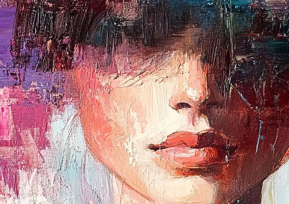 Face - This woman painting shows an expressive portrait with powerful brushstrokes and rich texture, with her face partially covered by abstract, vibrant patches of colour, giving a modern, urban look.