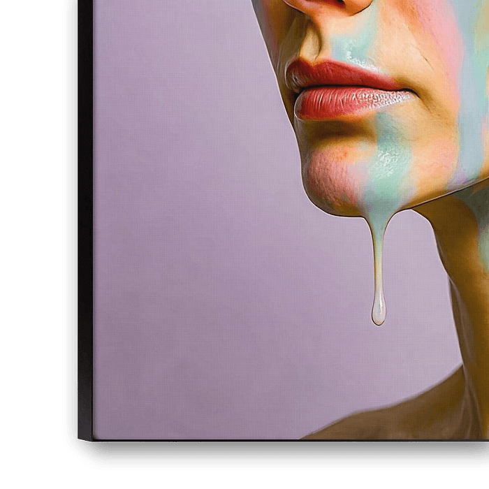 The contrast between the realistic skin and the surreal melting of colours creates a quiet tension. The background in a pale violet is deliberately restrained - so that the face can speak.