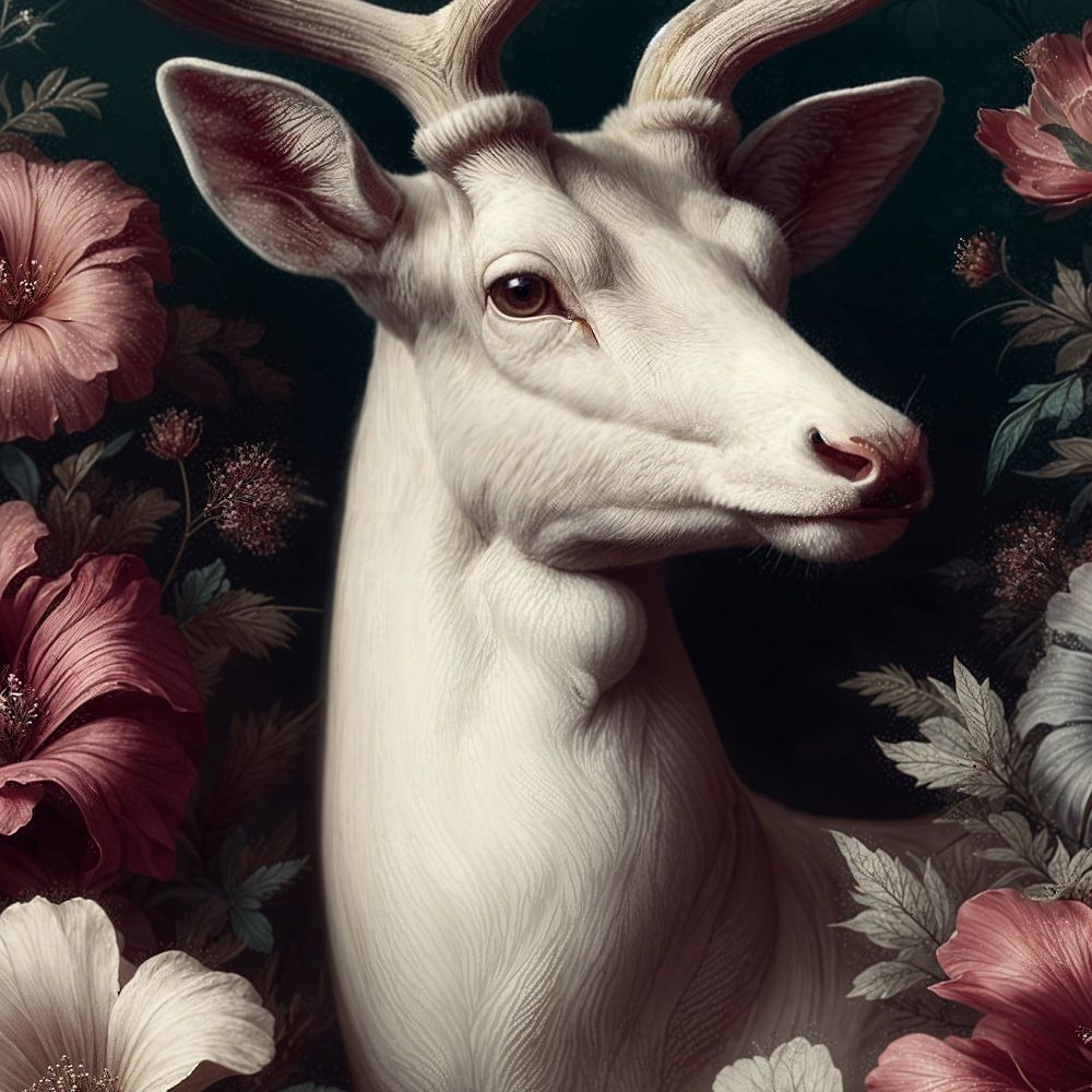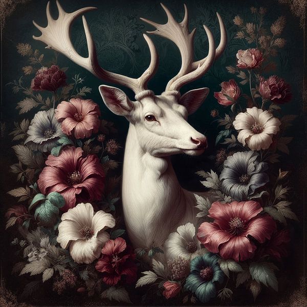 A portrait of a fairytale white deer surrounded by nature full of flowers. The digital artwork is made in the style of a classic painting. For a magical addition to your interior that makes you want to dream away.