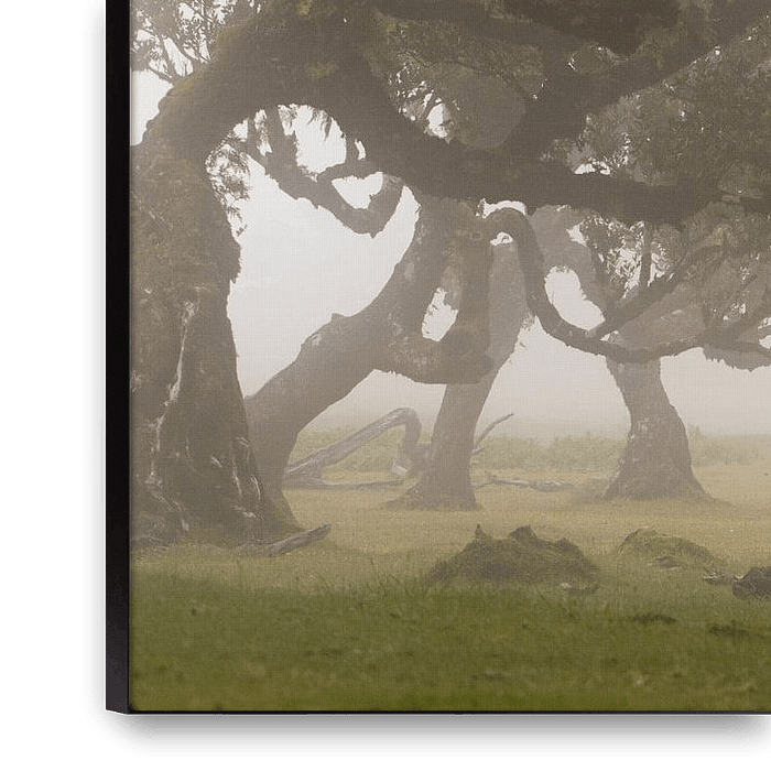The laurel trees and a cow are blurred by the fog pulling through the hilly landscape of the flower island.