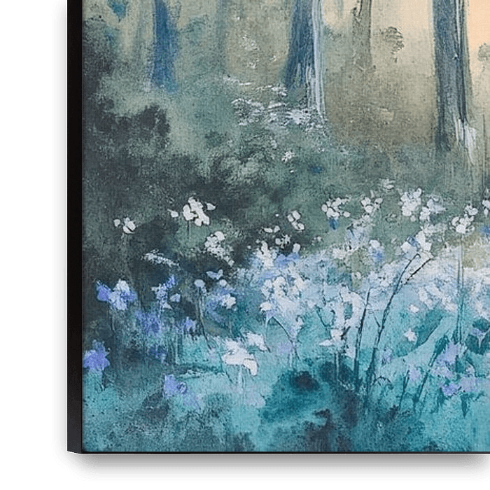 A gentle morning in the forest, flooded with golden rays of sunshine that illuminate the delicate flowers and lush greenery. Wisps of mist invite you to dream and create a calming atmosphere. Perfect for the bedroom, this work of art invites you to start the day peacefully or drift off into relaxing nights.