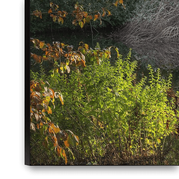 During an autumn walk in the park, I saw this fallen tree lying in the still water, against the slightly misty background of a scaffolded office building. In the foreground hangs foliage that is strongly illuminated by the sunlight.