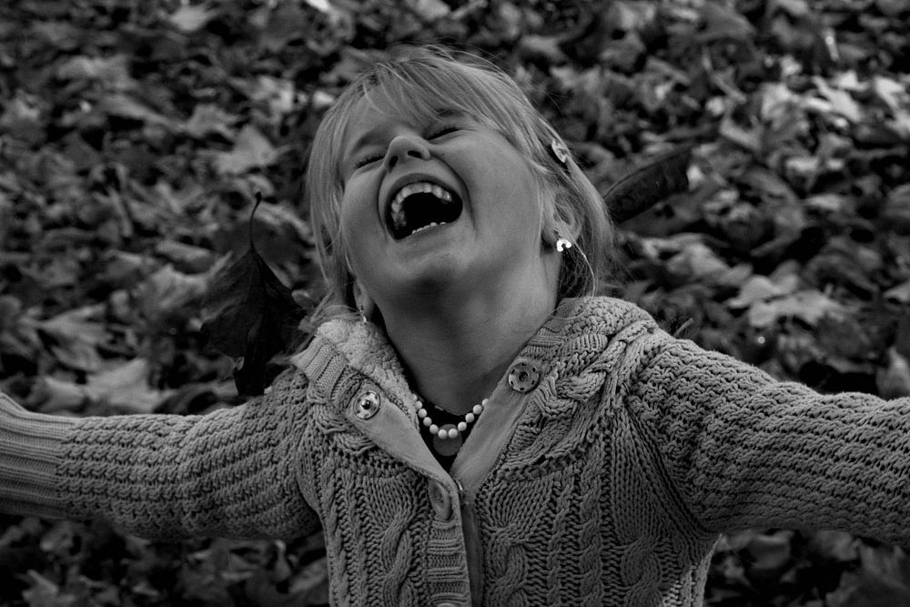 Girl having fun with falling leaves on her face