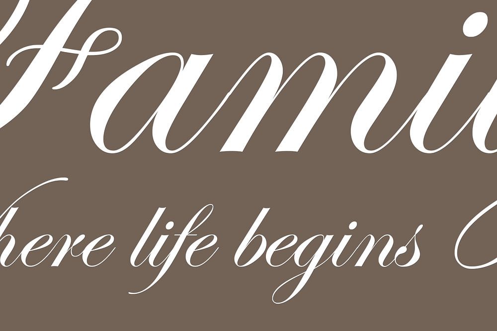 Family where life begins and love never ends. The background color is dark brown, the letters are white. Text on canvas or other material.