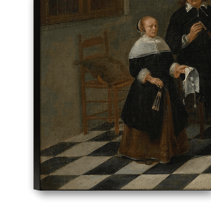 Van Brekelenkam emphasized the moral message by placing the large, framed landscape in the background. As the family displays domestic virtues, the painting within the painting shows a couple gazing at a ship at sea under a dark sky illuminated by a shaft of light. The painting within their home serves as a reminder to the family to look to the light as they continue on life's uncertain voyage.