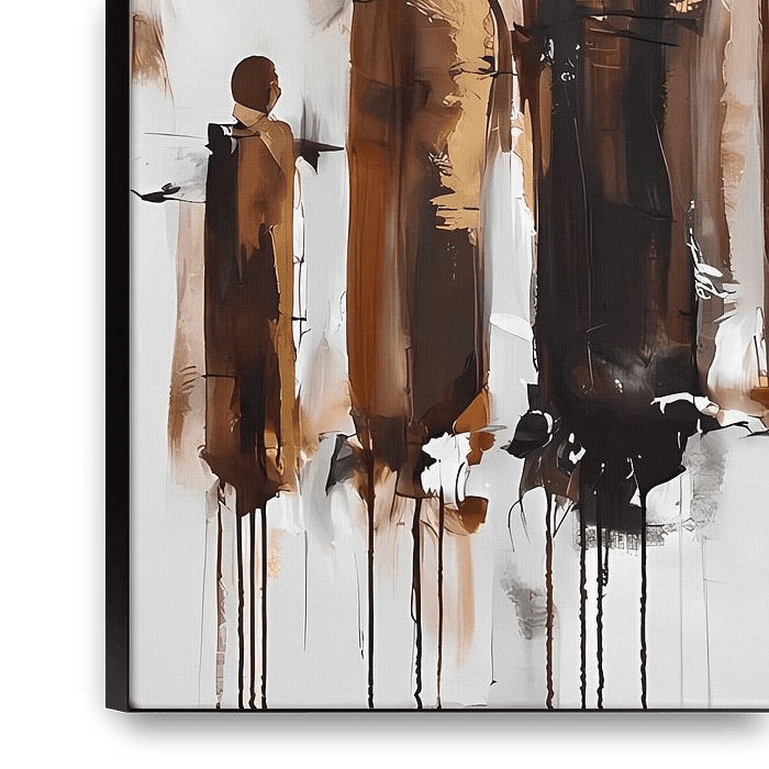This painting shows a family of five in an abstract, modern composition reminiscent of a family constellation. Five shapes stand in relation to each other, each with its own place and energy within the whole. Warm brown and gold tones connect the figures and refer to origin, value and mutual loyalty. The distance and direction between…