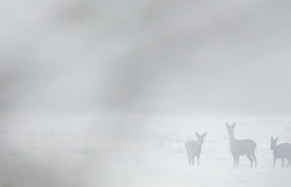 On a winter's day this family roe deer was walking in the snow in the floodplains near the river IJssel.