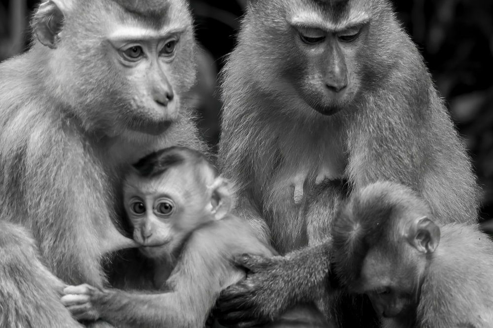 This intimate black-and-white photograph shows a group of macaques, including two adult monkeys and two younger monkeys, sitting close together. The adult monkeys seem to take care of the youngsters, who nestle close to them.