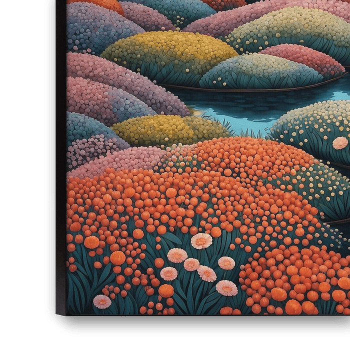 Fantasia Sylvara is a surreal artwork that brings to life a square fairytale landscape. The piece is an explosion of vibrant colours and imaginative shapes, which together create a world that balances between dream and reality. The landscape seems straight out of a magical story, with bold compositions that evoke suspense and mystery.