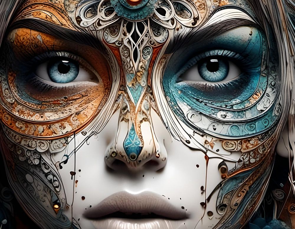 A highly detailed and intricate image portrays a female face adorned with ornate decorations that blend mechanical and floral elements in rich bronze and turquoise hues. Her eyes are strikingly realistic and convey a sense of depth and emotion amidst the surrounding fantastical embellishments.