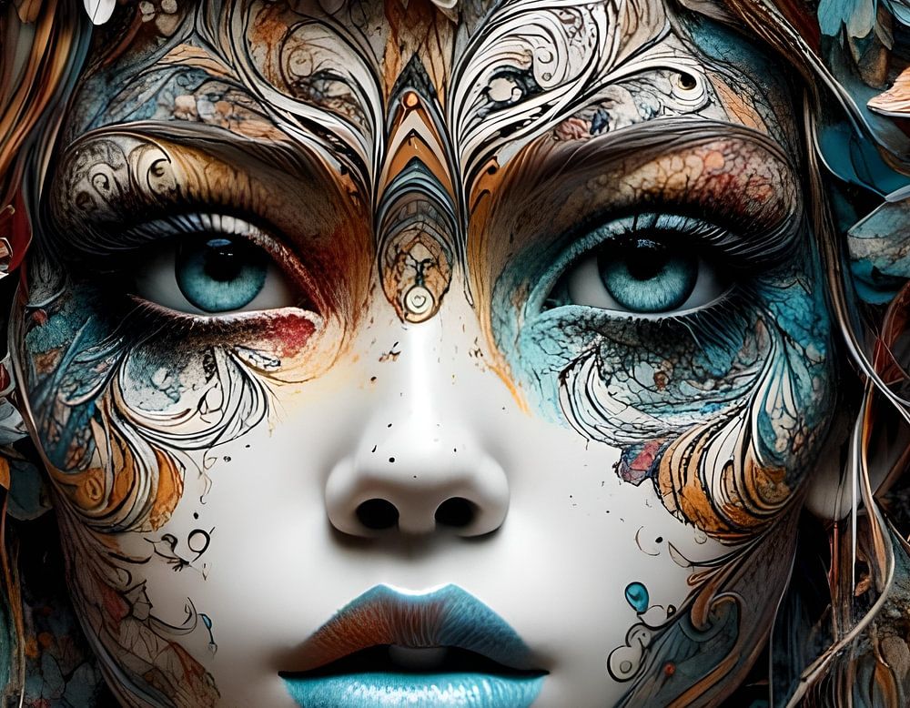 A colorful and intricate digital work featuring a female figure adorned with floral elements and ornate patterns on her face, creating a dreamlike and mysterious appearance. She has a serene expression with eyes that suggest depth and introspection, and the surrounding flowers blend into her form seamlessly, enhancing the fantastical feel of the composition.