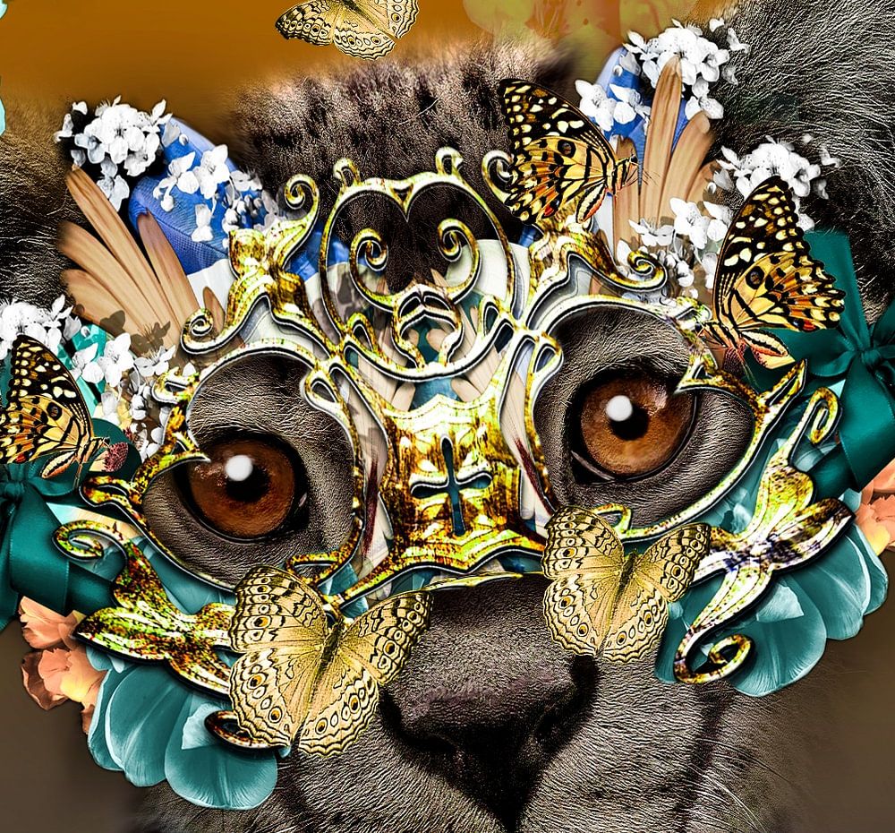 The little cheetah baby looks around curiously. He sees the golden butterflies fluttering. They seem to dance on the wind. He follows them with his eyes and tries to catch them with his paws. He hears the rustling of leaves and the buzzing of bees. He smells the sweet scent of the Japanese blossoms surrounding him. The mint-coloured flowers are a beautiful contrast to his mottled fur. He feels safe and happy in this wonderful world. The golden circle in the background symbolises the dawn of a new day.