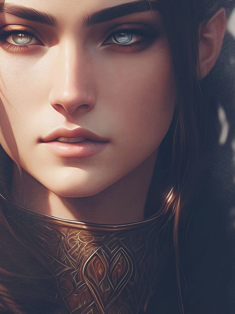 This work shows the portrait of a fantasy elf. This lady has beautiful light blue eyes and full lips. She is looking to the right. The background is grey-blue. This lady could have a role in a fantasy film about fairies, warriors and knights.