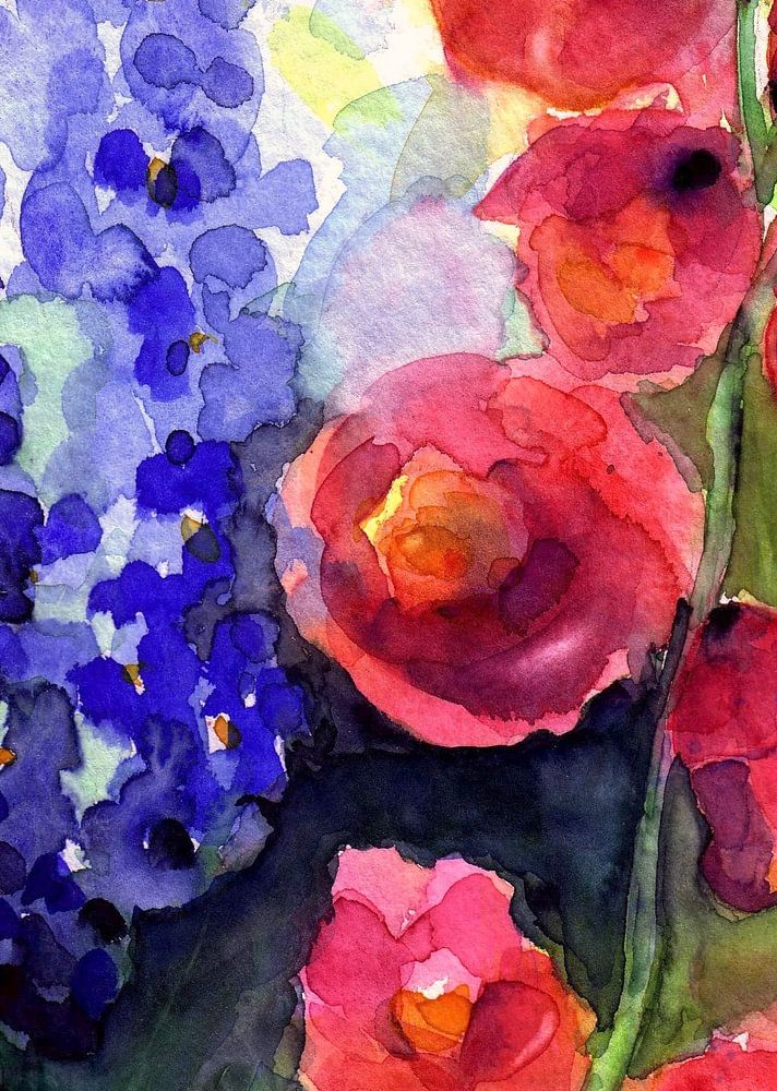 Auquarell with hollyhock and larkspur in a cottage garden.